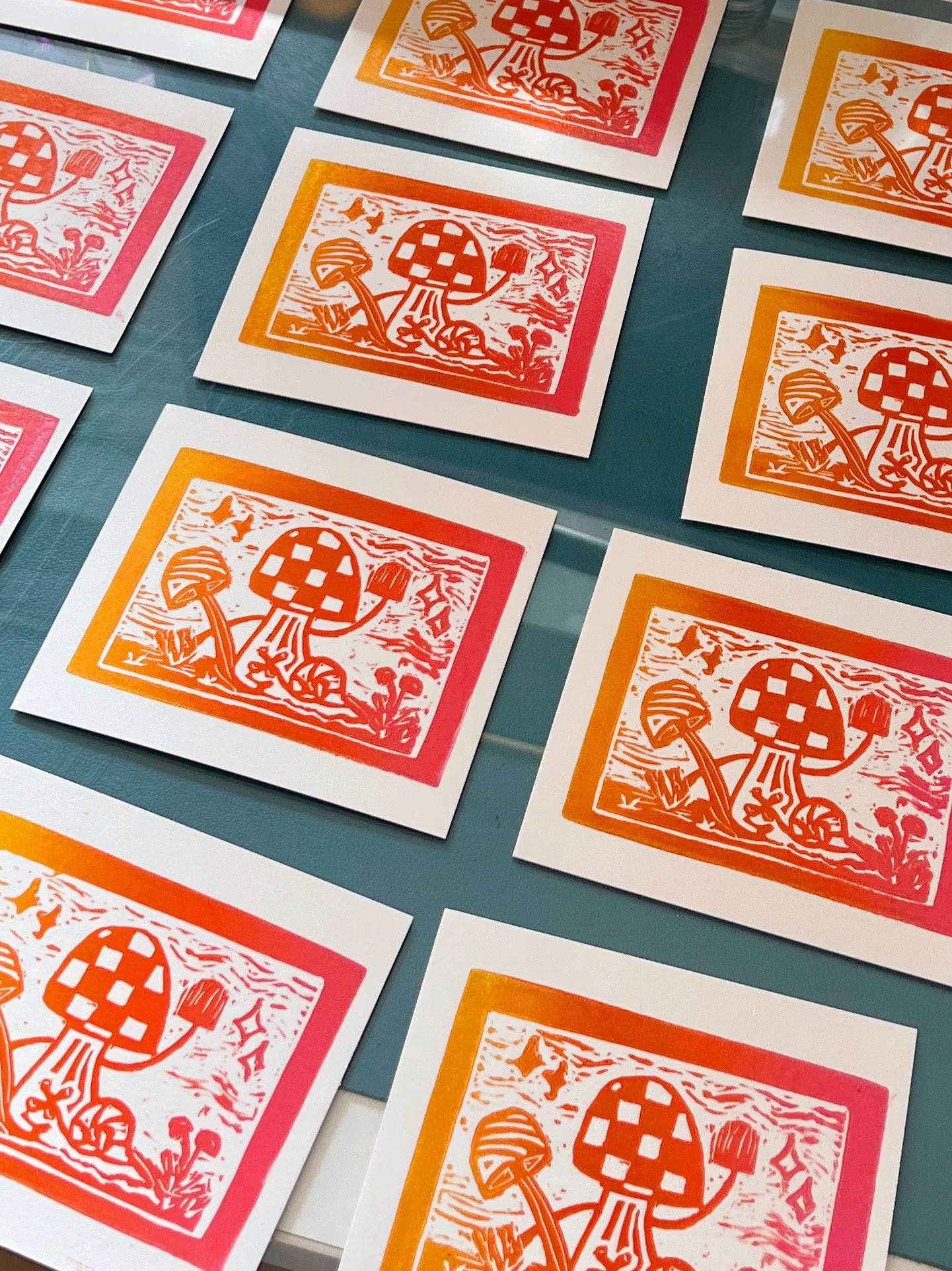 My artistic process combines my background in photography and fine art with my passion for color theory. When creating prints, I generally start by taking photos of my subjects, then digitally illustrate them and carve them into printing blocks. I also experiment with various pigments as I press each print.