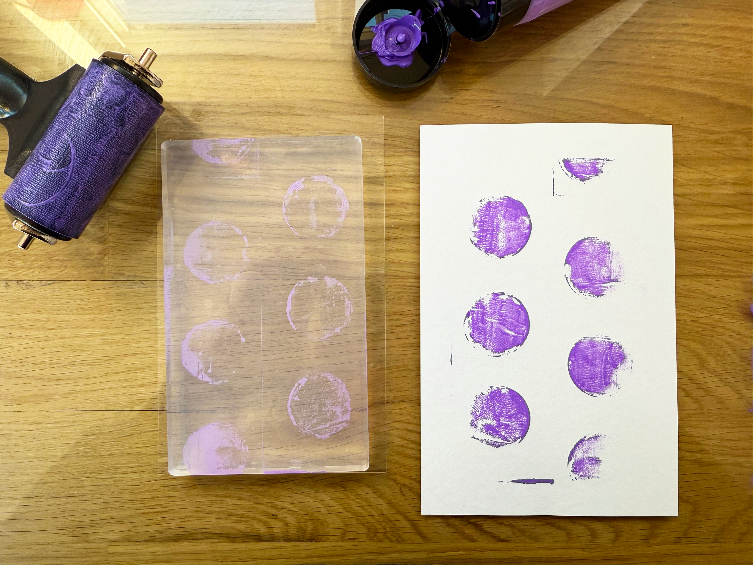 This is the most straightforward technique. Simply apply a layer of acrylic paint onto the gel plate using the brayer. Roll it out to an even coat and place your paper on top, then using the palm of your hand in a firm and circular motion transfer the paint to your plate. You can apply more layers of paint to create more textures or colors.